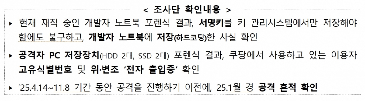 또 쿠팡은 서명키를 체계적으로 관리할 수 있도록 발급 내역을 기록·관리하도록 규정하고 있으나, 조사단은 키 이력 관리 체계가 부재해 목적 외 사용을 파악하는 조차 불가능함을 확인했다.