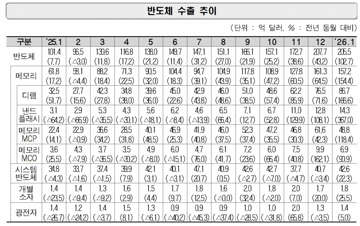 품목별 수출을 살펴보면 반도체가 가장 큰 성장세를 나타냈다. 반도체 수출액은 전년 동월 대비 102.7% 뛴 205억5000만달러를 기록했다. 메모리 반도체(D램, 낸드) 고정가격 상승과 고부가 제품(DDR5, HBM 등) 수요가 견조해 역대 1월 중 최대 수출액을 달성했다. 구체적으로 메모리반도체는 157억2000만달러(154.4% ↑),시스템반도체는 42억6000만달러(22.3% ↑)를 기록했다.
