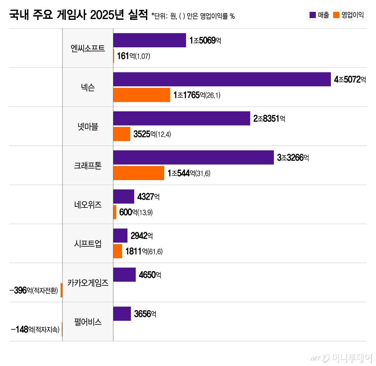 중견 게임사들은 상대적으로 선전했다. 네오위즈(25,850원 ▼500 -1.9%)는 'P의 거짓'과 '브라운더스트2' 성과에 힘입어 매출 4327억원, 영업이익 600억원을 기록했다. 전년 대비 각각 18%, 82% 증가했다. 두 스테디셀러 IP의 판매 흐름을 유지하는 한편, 내러티브 중심 신작 IP를 확보해 글로벌 팬덤 확장에 나설 계획이다.
