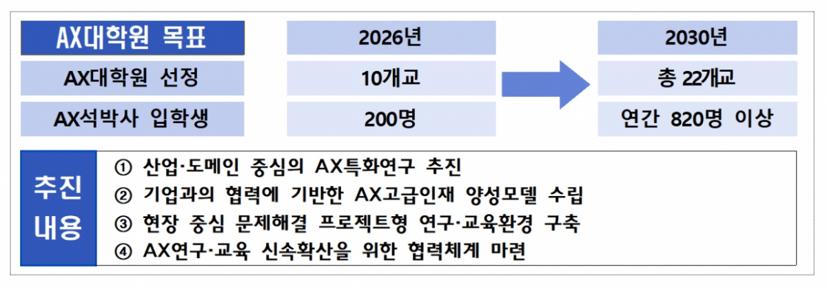배경훈 부총리 겸 과기정통부 장관은 "AI 3대 강국이 되려면 제조・바이오・에너지 등 우리 주력 산업에 AI를 실제로 적용할 수 있는 인재가 핵심"이라며 "신설되는 AX대학원이 필요한 핵심 인재를 키워내는 중심이 될 수 있도록 산업계・대학과 적극 지원하겠다"고 말했다.