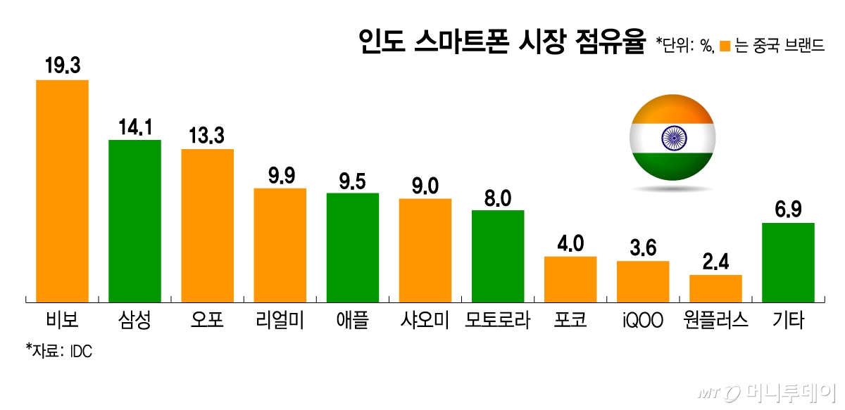 23일 시장조사업체 IDC에 따르면 지난해 인도 스마트폰 시장에서 삼성전자 점유율은 14.1%로 중국 비보(19.3%)에 이어 2위를 차지했다. 다만 3, 4위를 기록한 오포·비보를 비롯해 중국 스마트폰의 점유율이 61%를 넘는다. 애플은 9.5%로 5위에 그쳤다. 출하량 기준 세계 2위 시장인 인도를 중국 스마트폰이 점령한 셈이다.