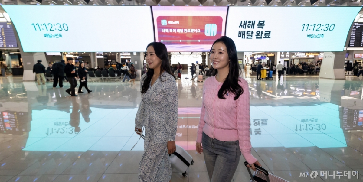 ![[서울=뉴시스] 김선웅 기자 = 12일 서울 강서구 김포국제공항 국내선 청사에 설치된 대형 LED 전광판에서 배달의민족 시보 광고가 송출되고 있다. 배달의민족은 설 명절을 맞아 오는 22일까지 김포공항, 제주공항 주요 공간에 설치된 대형 LED 전광판을 활용해 '여행의 설렘이 식지 않도록'을 주제로 연휴 기간 공항을 찾은 여행객들에게 새해 인사를 전하고 시간을 알려주는 시보 광고 캠페인을 전개한다. 2026.02.12. mangusta@newsis.com /사진=김선웅](https://thumb.mt.co.kr/cdn-cgi/image/f=avif/21/2026/02/2026022414415137380_1.jpg)