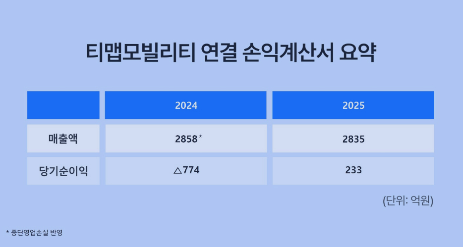 티맵모빌리티는 2025년 연간 기준 매출 28354억원, 당기순이익 233억원, EBITDA 44억원을 각각 기록했다고 24일 밝혔다. 중단영업손실 반영 기준 전년 대비 각각 299억원, 1007억원 증가했다. 두 지표가 동시에 흑자를 기록한 것은 이번이 처음이다. 영업손실도 전년보다 약 70% 줄었다. 회사 측은 고수익 사업 중심의 포트폴리오 재편과 비용 효율화가 맞물리며 수익 구조가 안정화됐다고 설명했다.