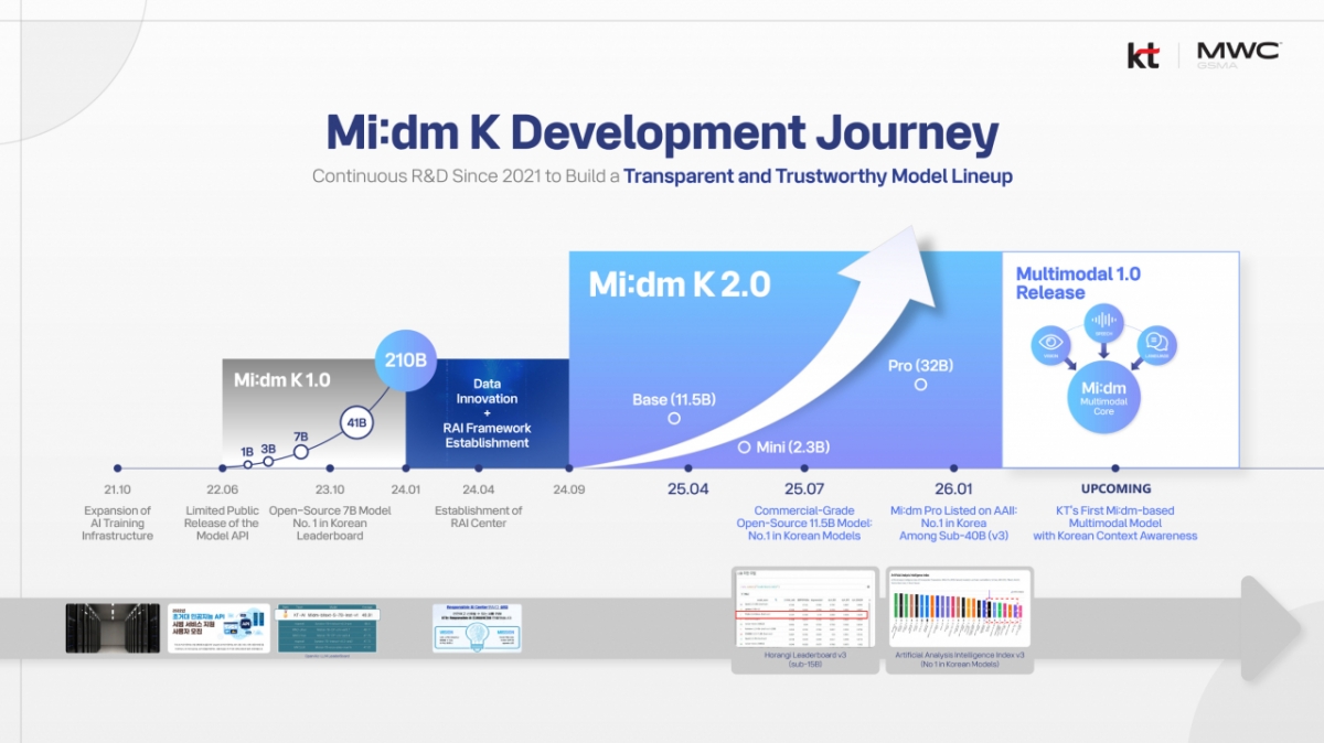 KT(65,600원 ▲100 +0.15%)가 다음달 2~5일(현지시간) 스페인 바르셀로나에서 열리는 세계 최대 이동통신 전시회 'MWC26'에서 한국 기업 환경에 최적화된 자체 개발 AI 모델 '믿:음 K'(Mi:dm K) 개발 여정과 기술 성과를 공개한다.