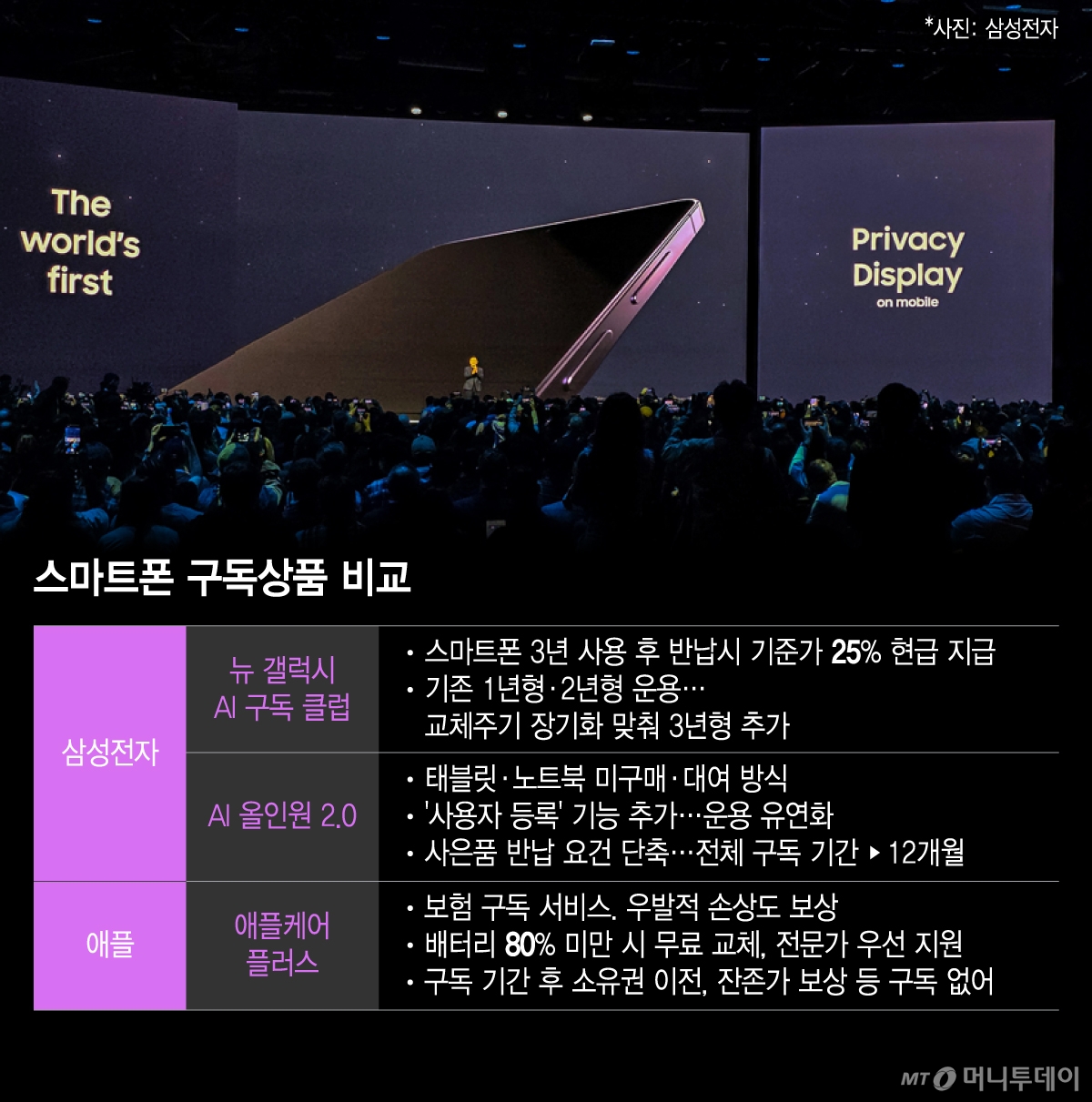 경쟁사 애플은 보험 구독 서비스 '애플케어플러스'를 운영한다. 떨어트림, 액체 접촉 등 우발적 손상도 무상으로 수리해준다. 배터리 용량 80% 미만 시 무료 교체, 애플 전문가 우선 지원 등 혜택도 제공한다. 다만 삼성전자처럼 빌려 쓰다가 소유권을 넘겨받는 방식은 아니다. 잔존가 보상은 '트레이드 인'이라는 별도 서비스를 이용해야 한다.