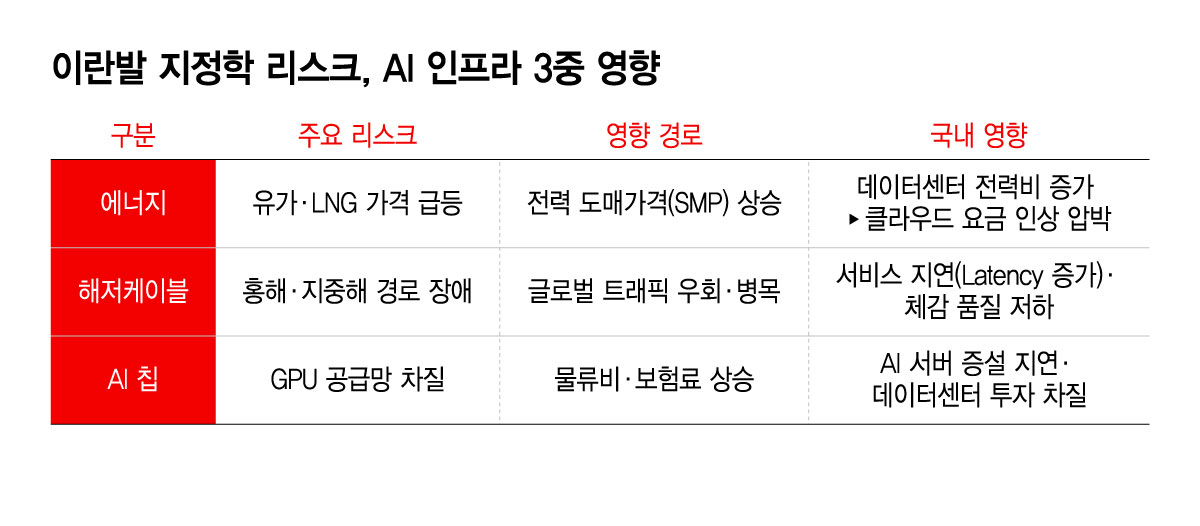 이란발 중동 지역 긴장이 커지면서 국내 클라우드와 AI 인프라 산업도 영향권에 들 수 있다는 분석이 나온다. 과거 전쟁의 영향이 유가 상승에 머물렀다면, 지금은 데이터 흐름과 AI 서버 운영까지 흔들 수 있다. 전력비 상승, 해저케이블 장애, AI 칩 공급 차질이라는 세 가지 위험이 동시에 수면 위로 떠올랐다.