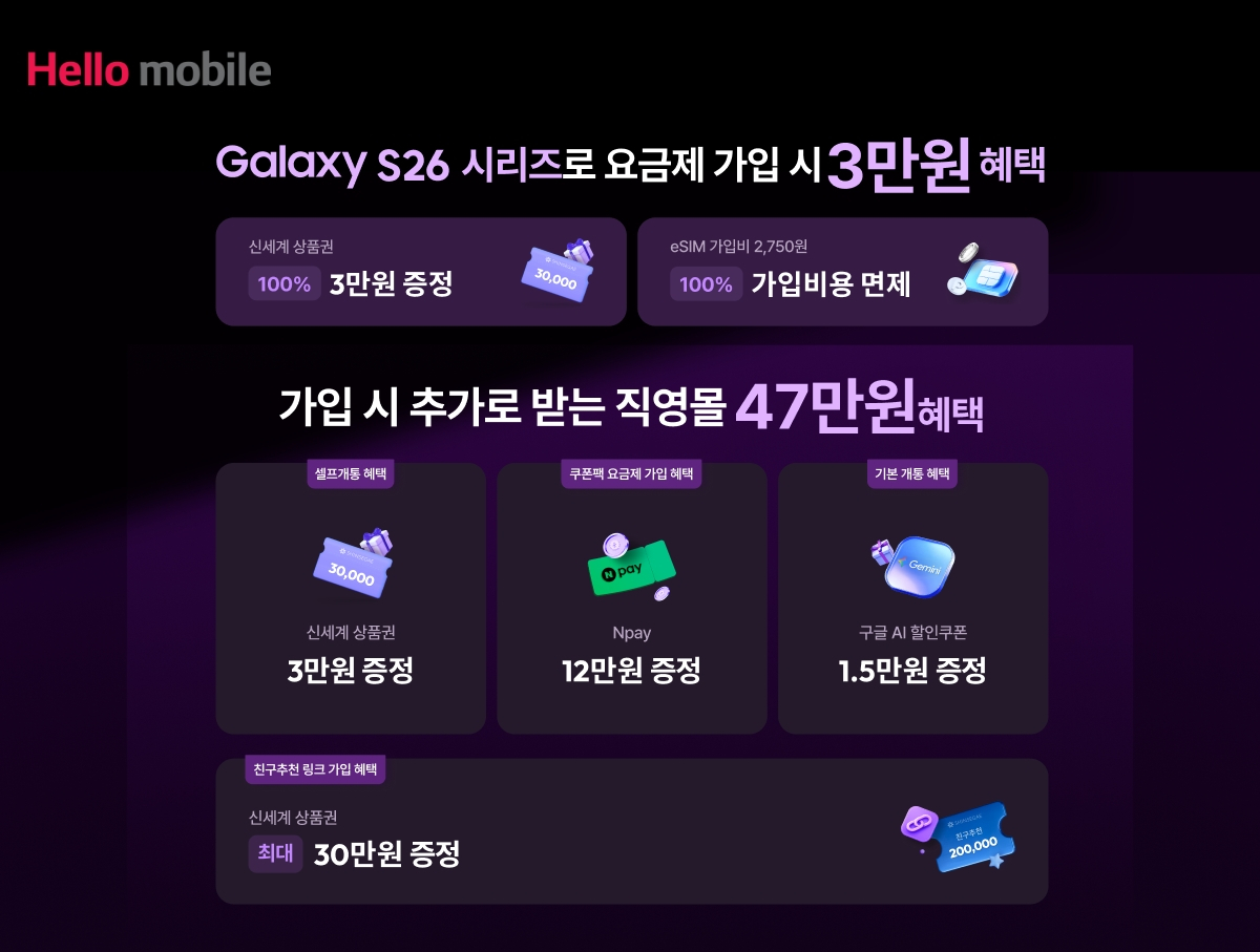 김예현 LG헬로비전 모바일사업담당은 "갤럭시 S26 출시를 맞아 알뜰폰 꿀조합을 찾아나선 실속파 소비자들에게 이번 프로모션이 특별한 새해 선물이 되길 기대한다"며 "헬로모바일은 앞으로도 최신 프리미엄폰 출시에 맞춰 매력적인 자급제∙투넘버용 알뜰폰 요금제와 서비스를 지속 선보이며 고객경험을 혁신하겠다"고 밝혔다.