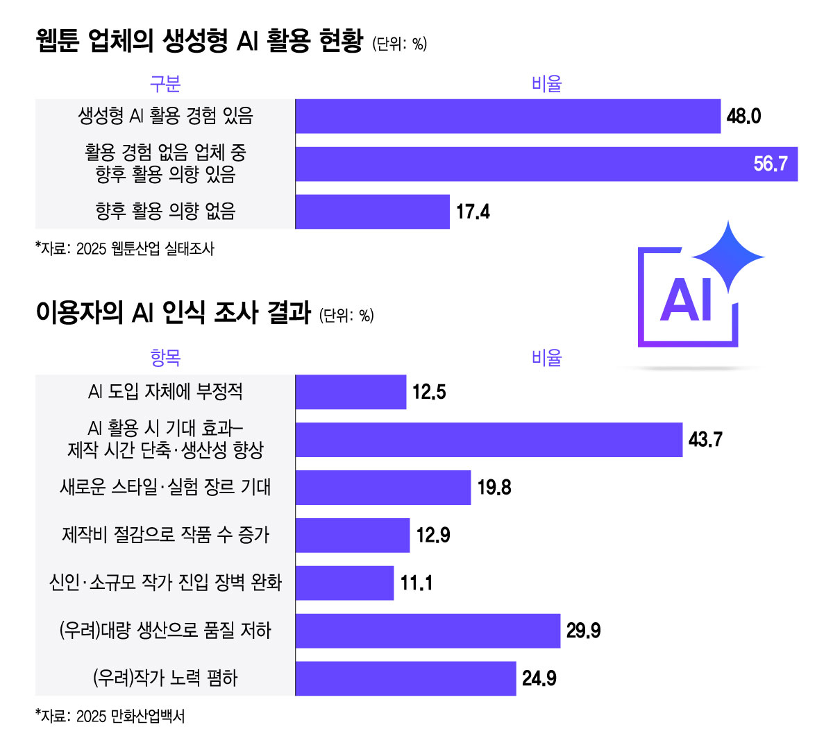 업계 관계자는 "독자들이 걱정하는 건 AI 사용 여부 자체라기보다 퀄리티 문제"라며 "극단적인 일부 이용자들은 'AI 절대 반대'라고 목소리를 크게 내지만, 다수 이용자는 재밌으면 본다는 분위기"라고 했다. 이어 "온라인에서 체감되는 반발과 실제 데이터 사이에는 간극이 있다"고 덧붙였다.
