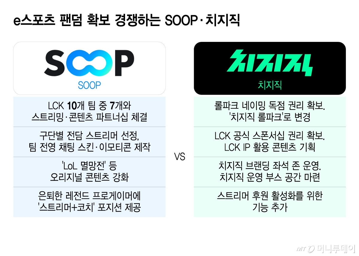 'LoL(리그오브레전드)' e스포츠 국내 프로리그 LCK 중계에서 유튜브가 이탈하면서 SOOP과 네이버(NAVER(222,000원 0%)) 치지직이 치열한 경쟁을 펼치고 있다. 각 사는 플랫폼 특성에 맞는 전략으로 LCK 팬덤 확보를 위해 나서고 있다.