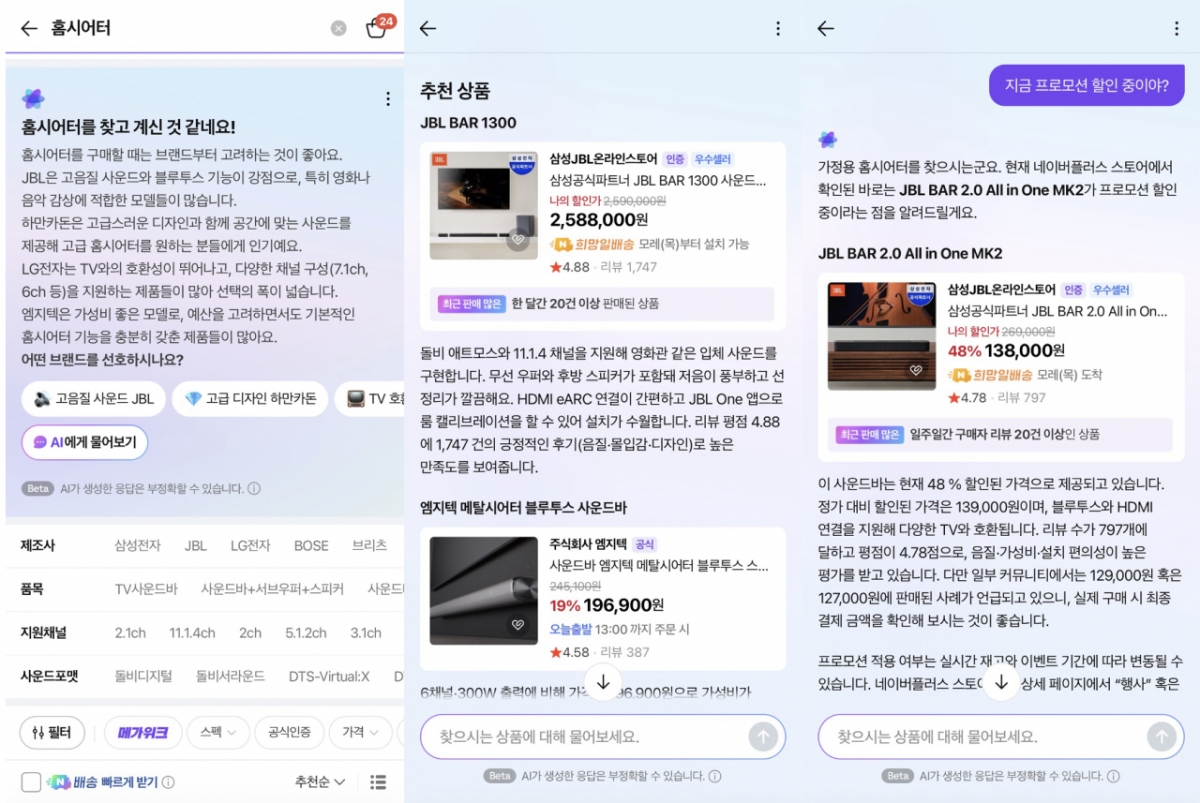 네플스 앱에서 쇼핑 키워드를 입력하면 AI 에이전트는 상품 선택에 도움이 되는 탐색 가이드를 제시하거나 'AI에게 물어보기' 기능을 통해 대화를 이어가도록 한다. 꼬리 질문을 던지면 추천이 더 구체화된다. 전용면적 84㎡ 아파트에 어울리는 제품으로 다시 추천해달라고 하자, 스마트스토어 리뷰 평점과 후기를 바탕으로 "넓은 공간에서는 300W 이상 출력과 5채널 구성을 추천한다"며 디자인과 크기까지 고려한 제품을 추천했다. 추천 결과는 개인화 기반이다. 사용자마다 혜택과 제안 내용이 달라질 수 있다.
