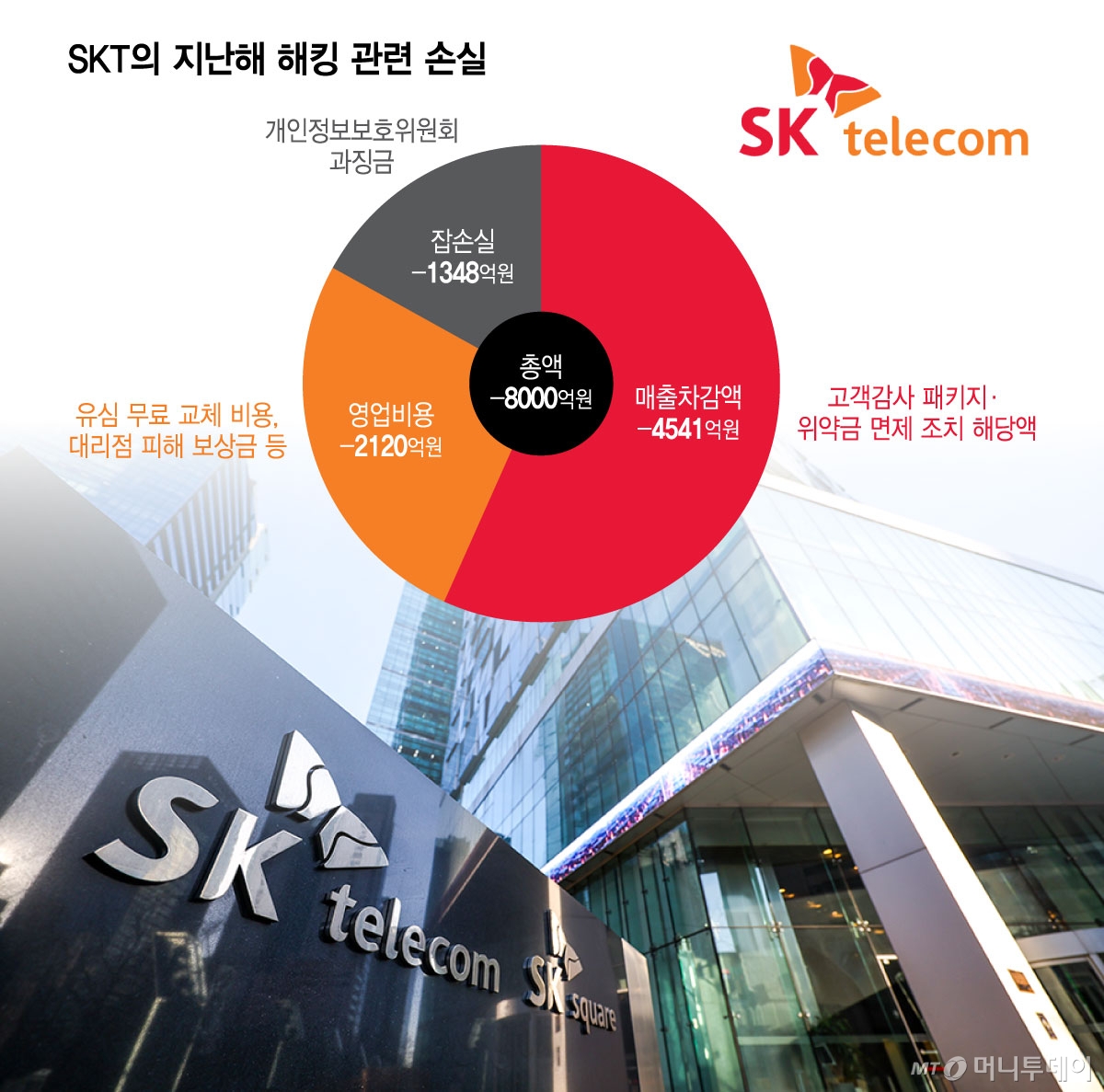 22일 금융감독원 전자공시시스템에 따르면 SKT는 지난해 사업보고서에 해킹 관련 손해액으로 △매출차감액 4541억원 △기타 영업비용 2120억원 △잡손실 1348억원 등 총 8000억원을 계상했다. 매출차감액은 고객감사 패키지와 위약금 면제 조치로 인한 금액이다. 영업비용은 유심 무료 교체, 대리점 손실 보전 등에 지출됐고 잡손실은 개인정보보호위원회가 부과한 과징금이다.