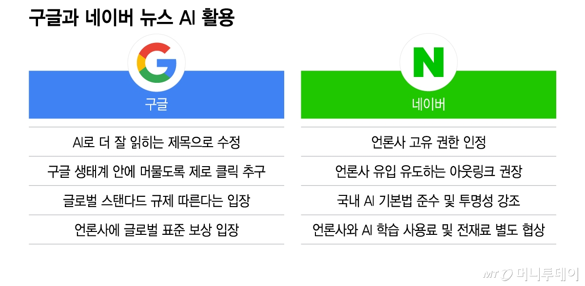 국내 포털과는 결이 다르다. 네이버(NAVER(210,500원 ▼11,000 -4.97%)) 뉴스스탠드는 기사를 각 언론사가 직접 편집한다고 안내하고 있다. 서비스별 운영 방식 차이는 있지만, 적어도 언론사가 정한 기사 제목을 플랫폼이 생성형 AI로 임의 변형해 노출하는 구조와는 거리가 있다. 업계에서는 구글이 언론사와 플랫폼의 역할 경계를 한층 더 흐리고 있다는 지적이 나온다.