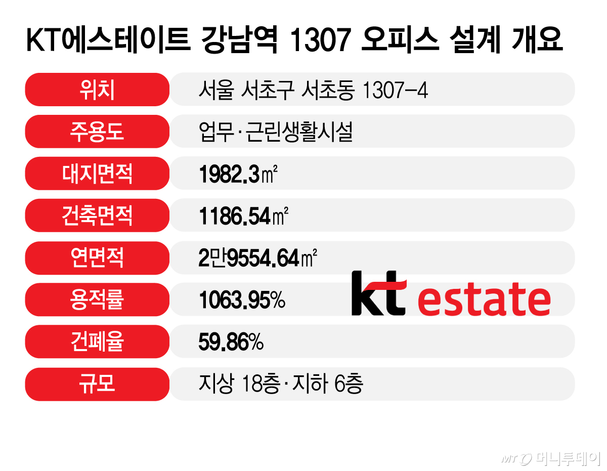 26일 업계에 따르면 KT에스테이트는 서울 서초구 강남역 인근 서초동 1307-4번지에 지상 18층·지하 4층 규모 '프라임 오피스'를 건설할 계획이다. KT에스테이트가 지난해 4분기 설립한 이 사업 관련 PFV(프로젝트금융투자회사)는 현재 코람코자산운용과 신탁계약을 맺어 1982.3㎡(약 600평) 규모 부지와 건물을 1790억원에 매입 중이다.
