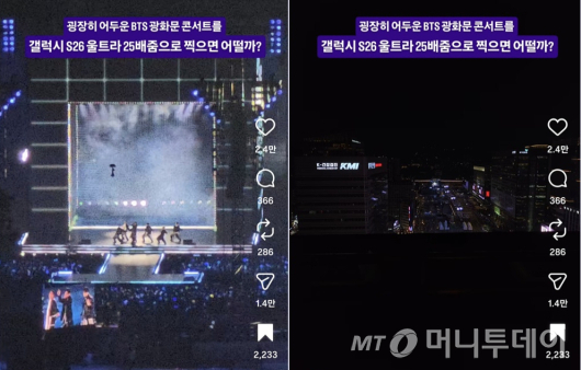 25일 인스타그램, 유튜브 등 SNS(소셜미디어)에는 BTS 광화문 콘서트 현장을 갤럭시S26 울트라로 찍었다는 인증글이 다수 올라왔다. 그중에서도 인스타그램 아이디 'ssangdoong' 계정으로 올라온 '어두운 BTS 광화문 콘서트를 갤럭시S26 울트라 25배줌으로 찍으면 어떨까'라는 제목의 영상이 인기다. 콘서트 당일 저녁에 조회수 100만회를 넘기더니 25일 오후 3시 기준 208만회를 기록 중이다.