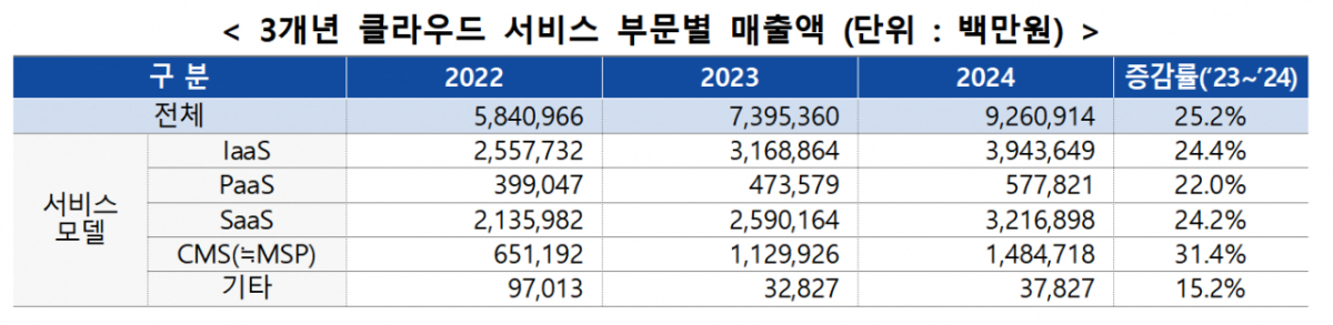 세부 유형별로 △서비스형 인프라(IaaS) 부문 매출액(3조94억원)이 24.4% △서비스형 플랫폼(PaaS) 부문 매출액(5700억원)이 22%, △서비스형 소프트웨어(SaaS) 부문 매출액(3조2200억원)이 24.2% 증가했다. 특히 클라우드 관리 서비스(CMS) 부문의 매출액(1조4800억원)이 전년 대비 31.4% 증가하며 두드러진 성장세를 보였다.