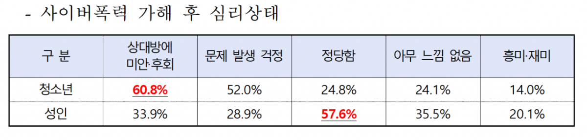 성인 사이버 폭력 가해자의 57.6%가 가해 후 "정당하다"고 생각했다는 통계가 발표됐다. 청소년 가해자는 60.8%가 미안함이나 후회의 감정을 느꼈다고 답했다. 방송미디어통신위원회는 사이버폭력 예방 교육을 강화할 계획이다.