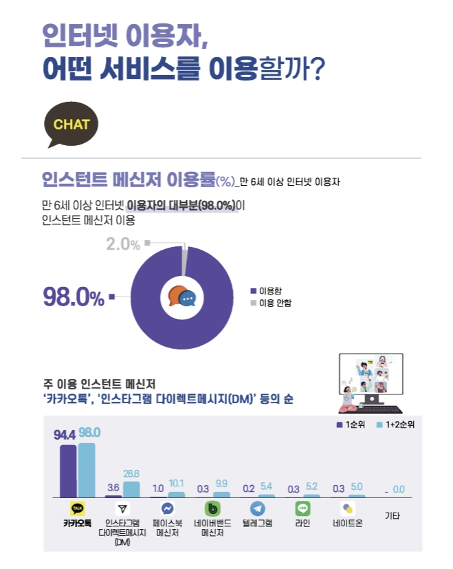 인터넷 이용자의 98.0%가 인스턴트 메신저를 이용했다. 가장 많이 쓰는 메신저는 카카오톡(98.0%), 인스타그램 다이렉트 메시지(28.8%), 페이스북 메신저(10.1%) 순으로 나타났다. 또 인터넷 이용자의 96.3%가 동영상 서비스를 이용하며, 주 평균 7.9시간을 이용하는 것으로 나타났다.