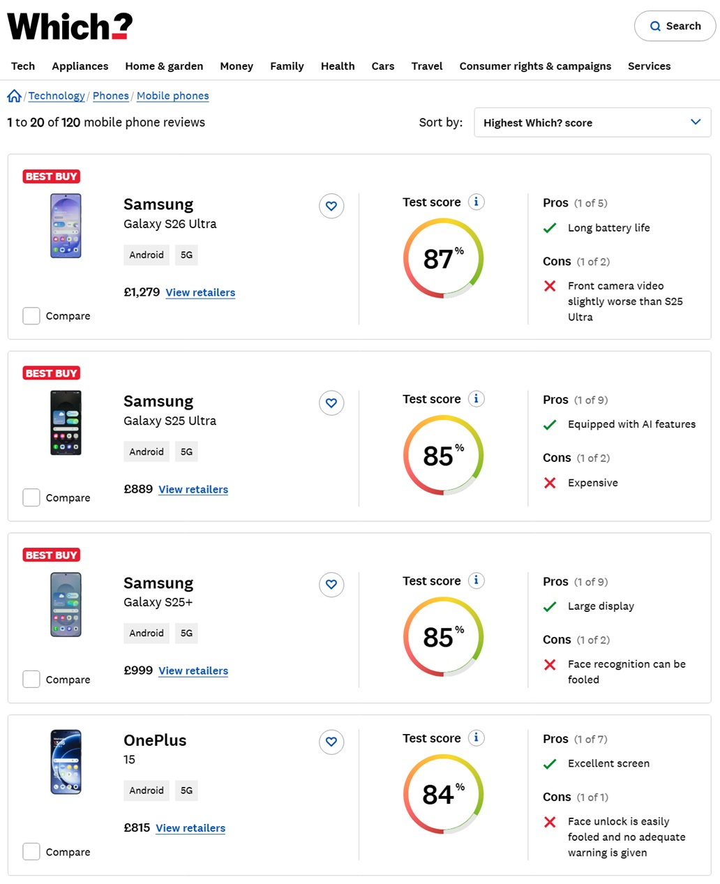 영국의 위치는 S26 울트라에 총점 87점을 매겼다. 위치는 "모든 실험실 테스트에서 뛰어난 성능을 보여줬다"며 "특히 '프라이버시 디스플레이'의 보안 성능이 높다"고 평가했다. 공동 2위는 85점을 받은 '갤럭시 S25 울트라'와 '갤럭시 S25+'가 차지했다.