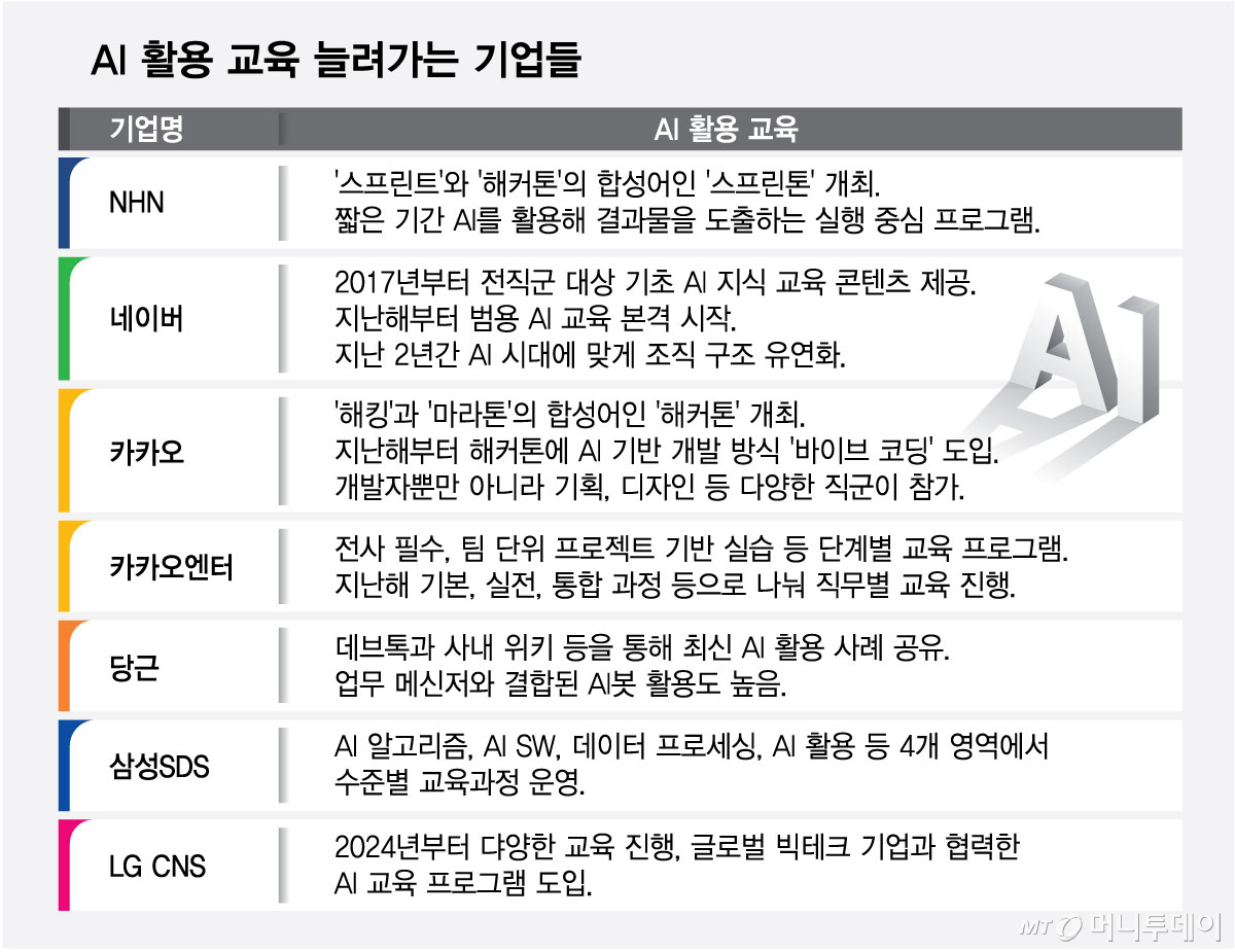 IT 업계 관계자는 "기업들이 AI를 안쓰면 도태된다는 생각으로 임직원 교육에 힘쓴다"며 "어떤 생성형 AI를 도입할지에 대한 논의는 끝났다. 누가 얼마나 더 똑똑하고 현명하게 사용하냐에 따라 경쟁력이 갈릴 것"이라고 말했다.