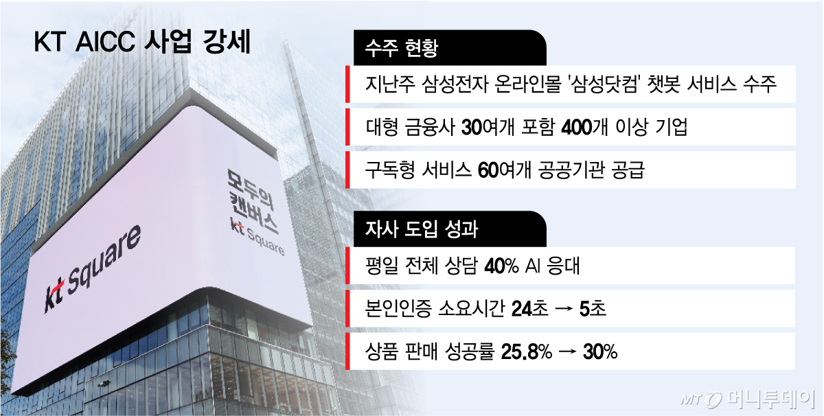 5일 업계에 따르면 KT는 지난달 27일부터 삼성전자 온라인몰 '삼성닷컴' 챗봇 서비스를 운영 중이다. KT는 현재 삼성전자와 대형 금융사 30여개사를 포함, 400개 이상 기업에 AICC를 공급 중이다. CSAP(클라우드보안인증)를 획득한 KT 구독형 서비스도 60여개 공공기관이 이용 중이다. 장기간 AICC를 운영하며 쌓은 데이터와 본인인증부터 후처리까지 전과정을 아우르는 기술력 덕이다.