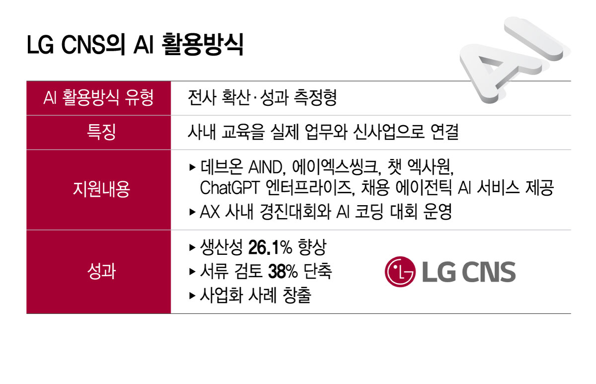LG CNS는 회사를 'AX 실험실'로 삼아 내부 업무에 AI를 먼저 적용하고, 여기서 검증한 기술과 서비스를 외부 사업으로 확장하는 전략을 쓴다. 직원 교육이 비용으로만 남는 것이 아니라 생산성 향상과 새로운 사업 기회로 이어질 수 있다는 걸 증명했다는 평가다.