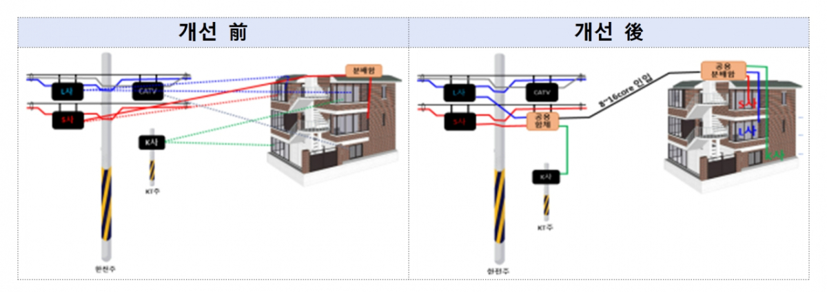 인입설비 공용화는 인입 구간(전주~건물)과 가입자 구간(건물인입단자~댁내)에 공용설비를 설치해 사업자간 설비를 공동 사용하는 것이다. 주택가 골목길의 인입케이블 방사형 설치구조도 개선한다.