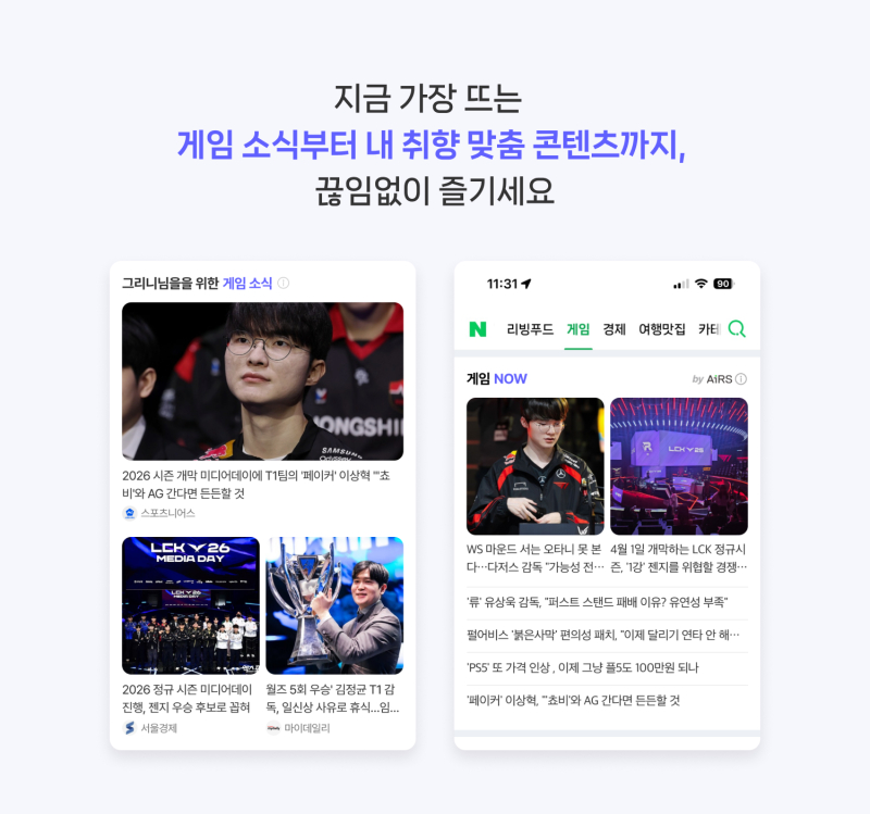 네이버(NAVER(202,000원 ▲500 +0.25%))가 이달 말 게임판 페이지를 피드형 서비스로 개편한다. 기존 콘텐츠 나열 방식에서 벗어나 사용자 개개인의 취향을 반영한 맞춤형 콘텐츠 제공에 초점을 맞췄다. 국내 게임 라이브 스트리밍 시장에서 SOOP(59,500원 ▼500 -0.83%)(숲)과의 경쟁이 치열해지는 가운데 e스포츠 팬들을 더 많이, 오래 붙잡아 두기 위해 사용자 편의성을 높인다는 계획이다.