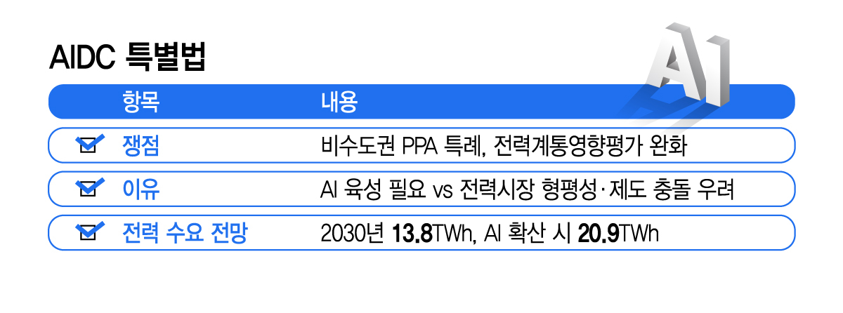 AIDC 특별법은 지난달 24일 국회 과학기술정보방송통신위원회 법안심사소위를 통과했다. 그러나 지난 9일 과방위 전체회의에서는 정족수 미달로 의결되지 못했다. 배경훈 과학기술정보통신부 장관은 같은 날 "AIDC 논의의 핵심이 전력 문제"라고 언급했다. 법안의 쟁점이 시설 확충 자체보다 전력 확보 방식에 있다는 점을 보여주는 대목이다.