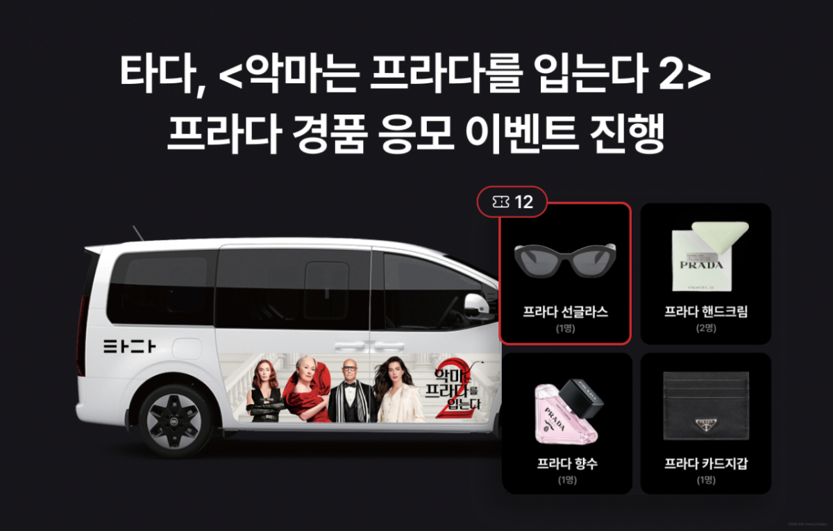 영화의 상징성을 담은 역대급 경품 이벤트도 눈길을 끈다. 5월10일까지 이어지는 이벤트 기간 타다를 이용할 때마다 경품 응모권을 무제한으로 받을 수 있다. 특히 목적지에 도착하면 응모권이 자동으로 지급돼 탑승할수록 당첨 확률이 높아진다. 추첨을 통해 영화 속 화려한 라이프스타일을 연상시키는 △프라다 선글라스(1명) △프라다 카드지갑(1명) △프라다 향수(1명) △프라다 핸드크림(2명) 등을 증정한다.