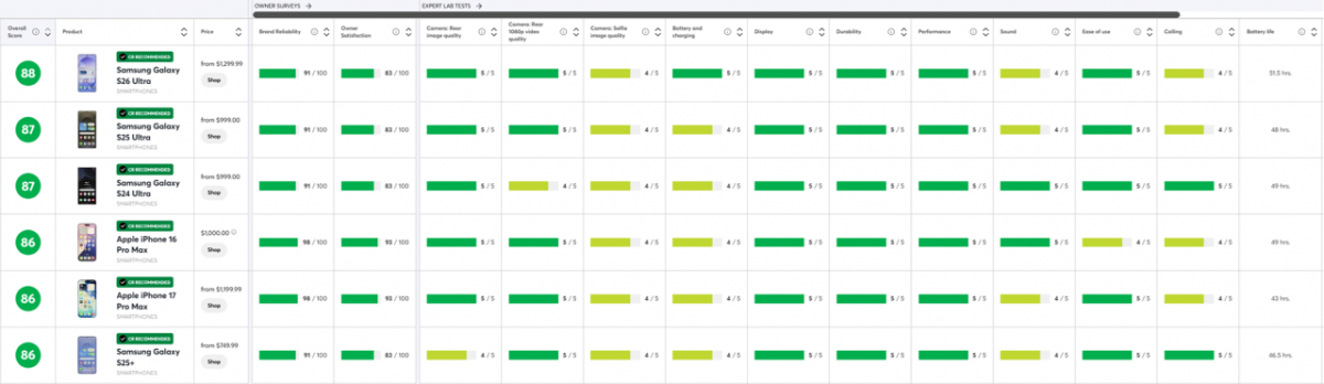 '갤럭시 S26 울트라'는 성능 평가와 신뢰도 및 만족도를 종합해 총점 88점으로 단독 1위에 올랐다.