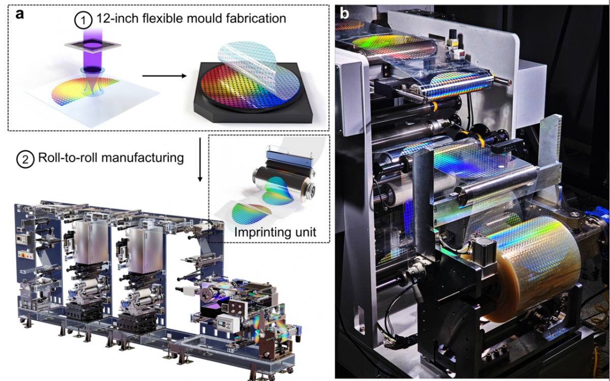 이에 연구팀은 성균관대 선도연구센터에서 개발한 롤투롤 인쇄 파운드리 기술을 활용해 유연한 기판 위에서 나노 구조체를 연속적으로 찍어낼 수 있는 롤투롤 나노 인쇄 공정을 독자 개발했다. 기존에는 딱딱한 니켈 금형을 사용해 메타렌즈를 하나씩 제작했으나, 연구팀은 12인치 면적의 원통형 롤러를 회전시켜 마치 신문을 찍듯 렌즈를 연속 인쇄하는 공정을 구현했다. 200m 길이의 연속 공정에서도 첫번째와 마지막 제작 렌즈의 성능 편차가 없는 것으로 나타났다.