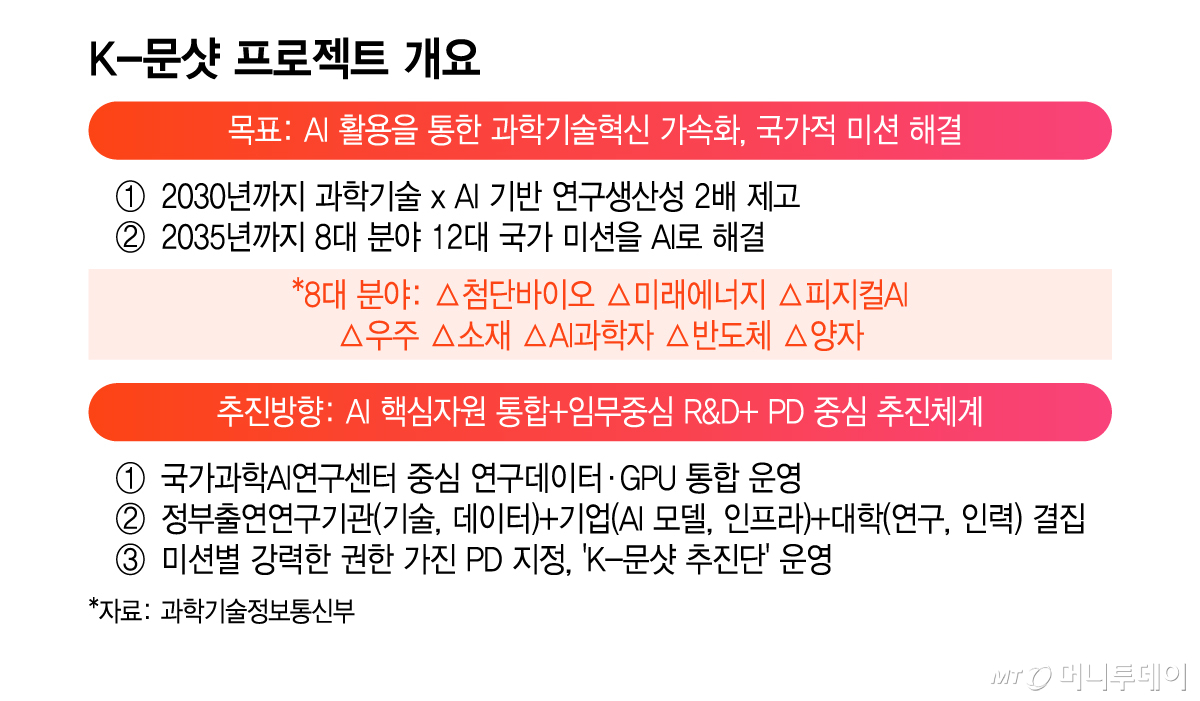 K-문샷 프로젝트는 과학기술과 AI를 결합해 12대 전략기술 분야 국가 미션을 달성하는 대형 사업이다. 국가 과학기술 AI 자원과 역량을 결집해 2030년까지 연구생산성을 2배 높이고 2035년까지 8대 분야(△신약 △태양전지 △SMR(소형모듈식원자로) △피지컬AI 범용AI △소재 △반도체 △BCI(뇌-컴퓨터인터페이스) △핵융합 △휴머노이드 △우주 △AI 과학자 △양자) 12대 국가 미션을 해결하는 게 목표다.