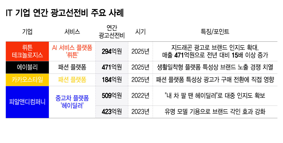 특히 생활밀착형 IT(정보기술) 플랫폼에서 이런 경향이 두드러진다. 에이블리는 2025년 광고선전비로 471억원을 집행했다. 카카오스타일도 같은 해 184억원을 썼다. 패션 플랫폼은 많이 보이고 많이 떠올라야 구매로 이어진다는 점에서 광고의 역할이 크다.