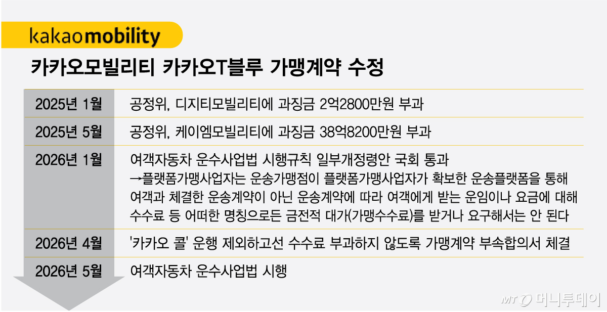 19일 업계에 따르면 카카오모빌리티 관계사 디지티모빌리티 등은 지난 14일부터 가맹택시 기사들과 '가맹계약 부속합의서' 체결을 진행 중이다. 디지티모빌리티는 2025년말 기준 카카오가 35.1%의 지분을 보유한 대구·경북 카카오T블루 가맹 파트너사로 대구 지역 내 가맹택시 시장의 89.5%를 차지한다.