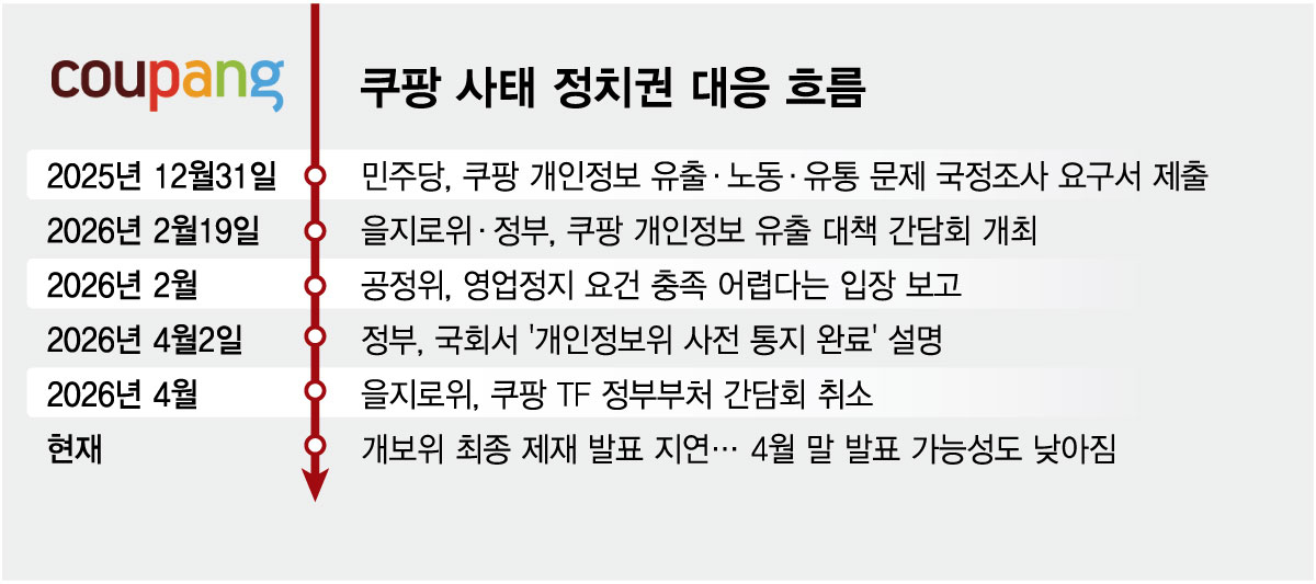 쿠팡 개인정보 유출 사태를 둘러싼 정치권과 정부의 전방위 대응이 속도를 잃고 있다. 국정조사는 4개월째 제자리고, 더불어민주당 을지로위원회 태스크포스 간담회는 취소됐으며, 개인정보보호위원회의 최종 제재도 당초 예상됐던 4월 말 발표가 사실상 어려워졌다. 정치권 안팎에서는 통상이슈 비화와 선거철 임박 등 변수에 부담을 느낀 여권과 정부가 이 사안에 대한 개입을 의도적으로 최소화하는 방향으로 기류를 바꾼 것 아니냐는 해석이 나온다.