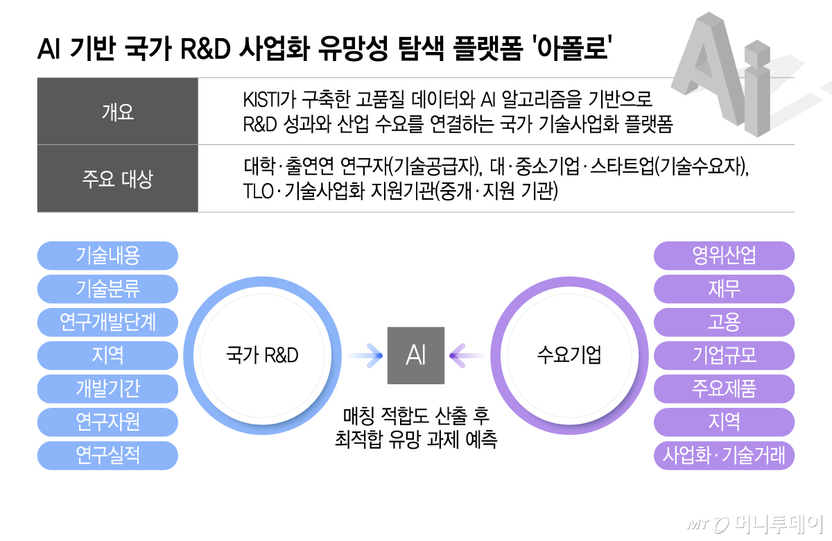 변정은 KISTI 기술사업화연구센터장은 "국가 R&D 투자 규모가 35조원을 넘어선 만큼 이를 국민이 체감할 수 있는 실질적인 성과로 만들어 내야 한다는 책임감도 커졌다"며 "아폴로가 수억 원을 투자하고도 빛을 보지 못한 채 잠들어 있던 국가 R&D 성과를 재조명해주는 역할을 하게 될 것"이라고 했다.