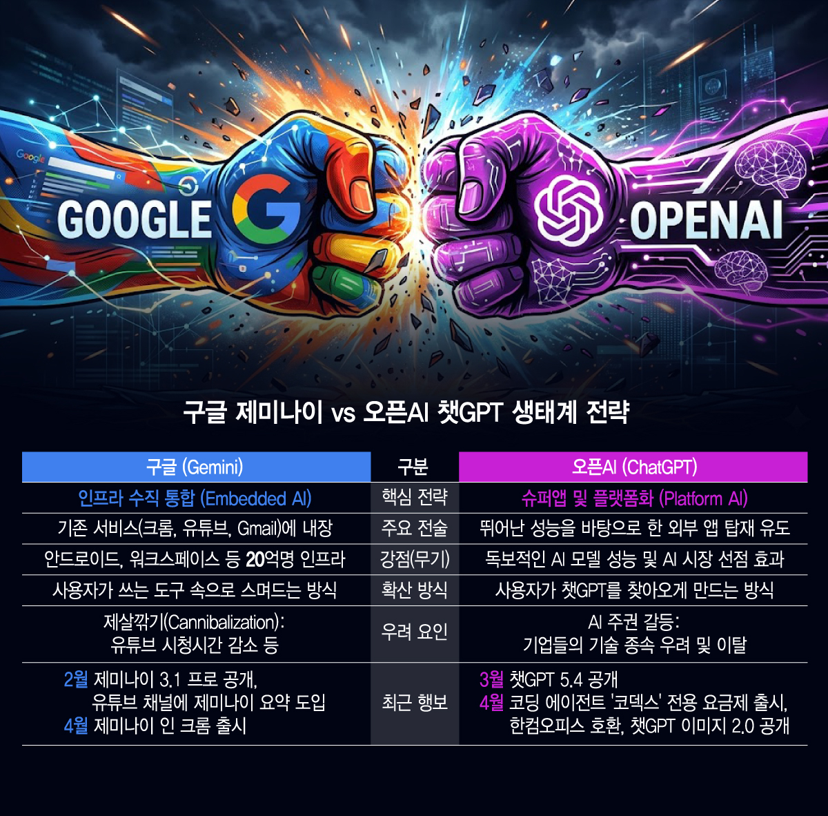 생성형 AI(인공지능) 시장의 두 축을 이루는 구글과 오픈AI의 생태계 전쟁이 치열하다. 막강한 구글 인프라에 제미나이를 연결하는 '내장형' 방식으로 사용자의 삶에 녹아드는 반면 오픈AI는 챗GPT의 뛰어난 성능을 무기로 전세계 기업을 자신의 플랫폼으로 끌어들이는 '슈퍼앱' 전략으로 맞선다.