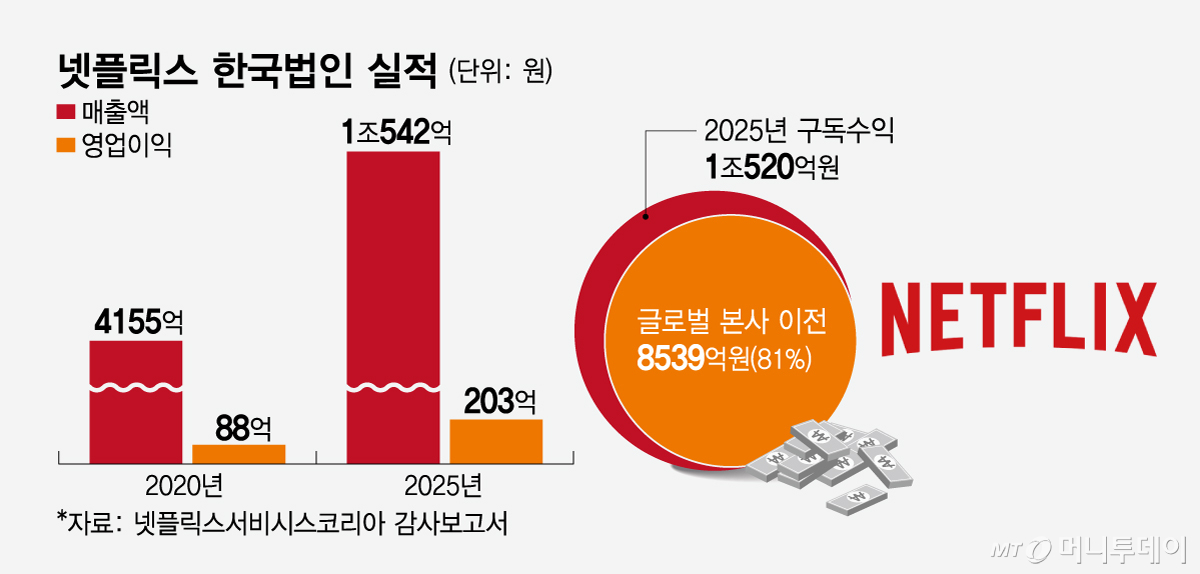 그러나 눈부신 외형 성장과 달리, 영업이익률은 6년째 2% 안팎이다. 넷플릭스 한국법인이 벌어들인 구독료 수익의 80% 이상을 '구독 멤버십 구매 대가' 명목으로 글로벌 본사에 보내고 있어서다. 지난해 기준 국내 매출의 약 81%인 8539억원이 본사로 송금됐다.