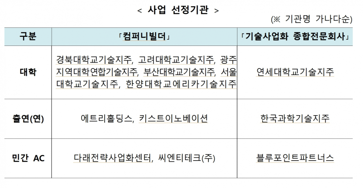 '컴퍼니빌더 지원형'은 유망 공공기술을 활용해 기획창업 활성화를 목표로 하는 사업이다. 대학, 출연(연)의 기술지주회사와 민간 AC(액셀러레이터) 중 창업·사업화 역량이 우수한 10개 기관을 선정했다. 기관당 연 10억원(5년간 총 47억5000만원)을 지원하며 선정된 기관은 우수 공공기술 발굴, 맞춤형 초기창업·보육 및 초기 투자 유치 등의 활동을 수행한다.