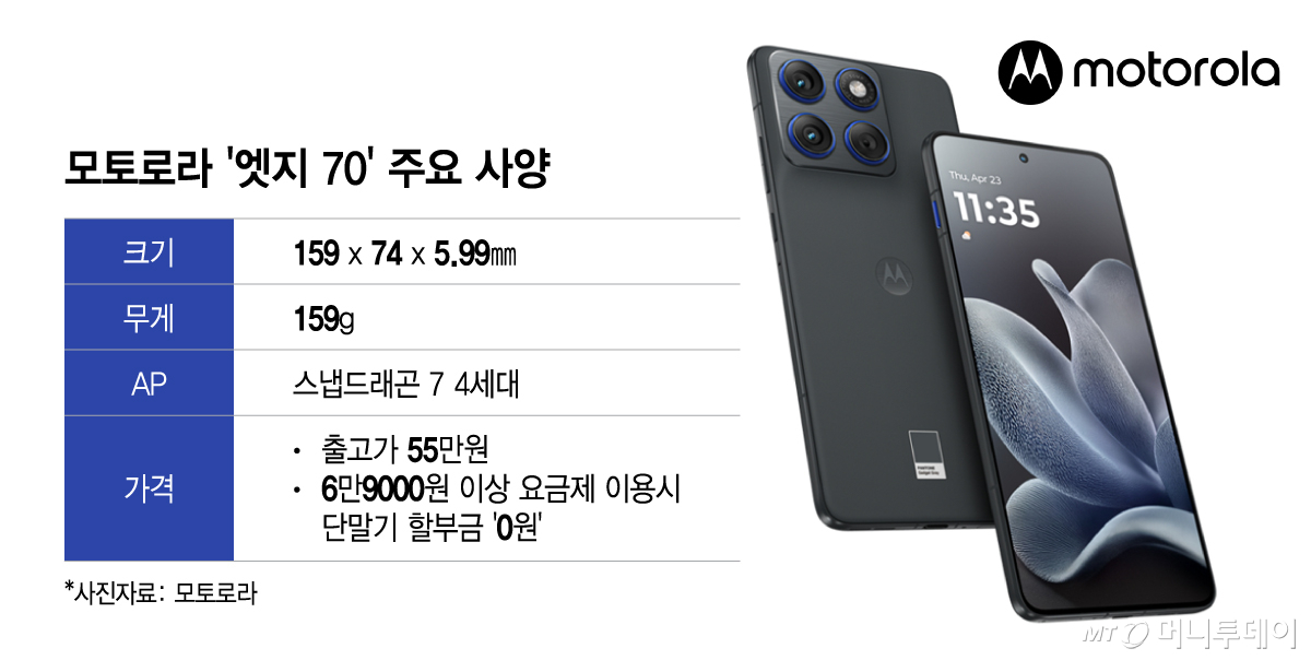 '0원'에 구매할 수 있는 가격도 강점이다. 엣지 70의 국내 공식 출시가는 55만원이다. KT(61,700원 ▼300 -0.48%) 공식 온라인몰 'KT닷컴'에서 5G 심플 110GB' 요금제(월 6만9000원)를 선택하면 공통지원금 45만원과 추가지원금 10만원이 제공돼 단말기 할부금이 '0원'이 된다. 유럽 출시가격(799유로, 약 139만원) 대비 60% 가량 저렴하다. 유럽 모델의 저장공간이 512GB(기가바이트)로 한국 모델(256GB)보다 크지만 저장공간에 따른 가격 차이가 통상 10~20%에 불과한 점을 감안하면 가격 경쟁력이 높다.