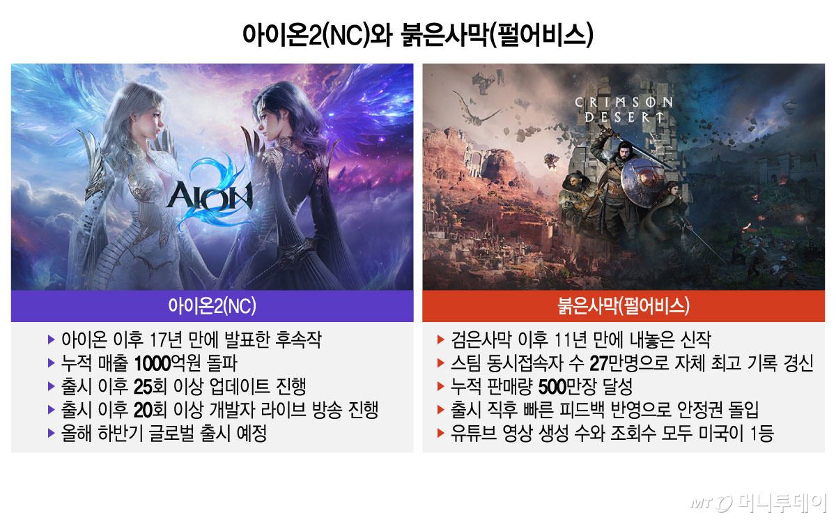 아이온2는 전작 아이온 출시 17년 만에 나온 후속작이다. 아이온은 국내 PC방 점유율 차트에서 160주 연속 1위를 차지하고 2013년 누적 매출 1조원을 돌파하는 등 NC를 지탱해 온 핵심 IP다. 지난 몇 년간 다양한 장르에 도전했다가 쓴맛을 본 NC는 결국 가장 잘하는 MMORPG(다중접속역할수행게임) 장르로 부활에 성공했다.