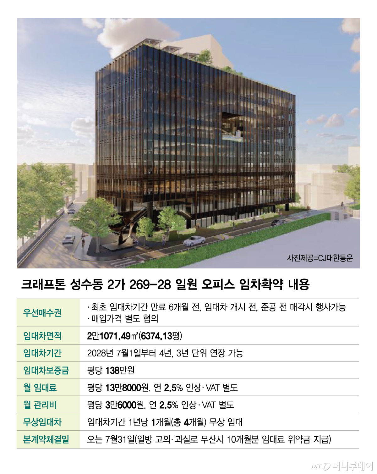 26일 머니투데이는 크래프톤과 마스턴제172호성수오피스PFV의 임차확약서를 단독으호 확보했다. 이에 따르면 임차인 크래프톤은 성수동2가 269-28 일원에 들어서는 연면적 2만1071.49㎡(약 6374.13평)의 오피스 건물에 대한 우선매수권을 확보했다. 우선매수권은 △최초 임대차기간 만료 6개월 전 △임대차 개시 전 △건물준공 전 임대인이 오피스를 매각하고자 하면 행사할 수 있다. 구체적인 매입가격은 별도 협의를 거쳐 결정한다.