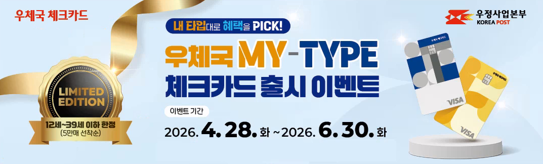 박인환 우정사업본부장은 "우체국 MY-TYPE 체크카드는 이용자 취향과 소비 성향을 반영해 디자인과 혜택을 직접 선택할 수 있도록 기획한 상품"이라며 "출시 기념 프로모션을 통해 더 많은 젊은 이용자가 우체국 금융을 쉽고 친근하게 경험하길 기대한다"고 말했다.