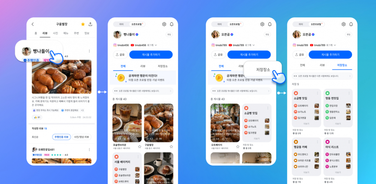 '오픈 프로필'은 티맵에서 쌓아온 리뷰와 저장 장소를 다른 이용자와 공유할 수 있는 기능이다. 이용자는 취향이 비슷한 사람의 리스트를 참고해 새로운 장소를 탐색할 수 있다.