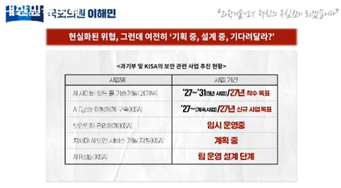 28일 국회 과학기술정보방송통신위원회 전체 회의에서 이해민 조국혁신당 의원이 공개한 자료에 따르면 △과학기술정보통신부의 'AI 사이버 쉴드 돔 기술개발' △한국인터넷진흥원(KISA)의 'AI 사이버 예방체계 구축' 사업은 2027년 착수 예정이다.