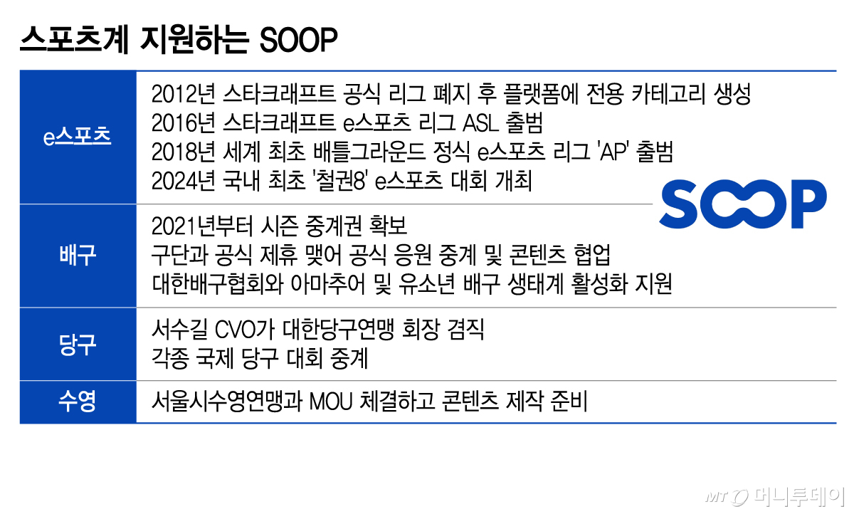 2010년 불거진 승부조작 의혹으로 2012년 스타크래프트 리그가 공식적으로 폐지되자 SOOP은 플랫폼 내에 프로게이머들을 위한 카테고리를 마련하고 활동 무대를 제공했다. 2016년에는 스타크래프트 e스포츠 대회 ASL을 출범해 새로운 무대를 만들었다. 올해로 11주년을 맞은 ASL은 누적 시청자 2억명을 돌파했다.