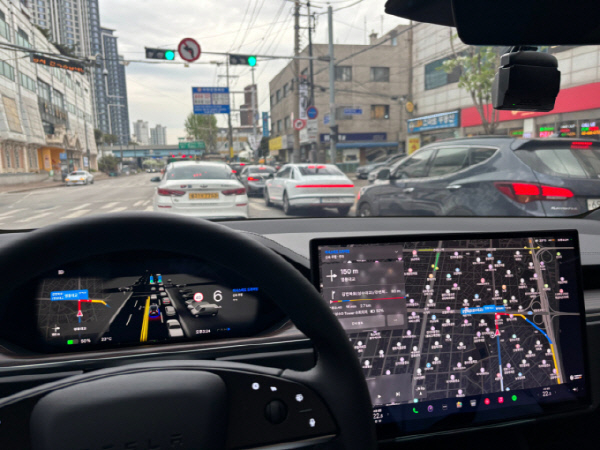 서울숲 인근에서 출발해 영동대교로 향하자마자 도로는 아수라장이 됐다. 차량이 복잡하게 뒤엉킨 혼돈의 구간, 모델X는 망설임 없이 우회전 깜빡이를 켜며 합류를 시도했다. AI(인공지능)는 잠시 기회를 엿보더니 신호가 바뀌는 찰나의 틈을 놓치지 않고 매끄럽게 차선을 파고들었다.