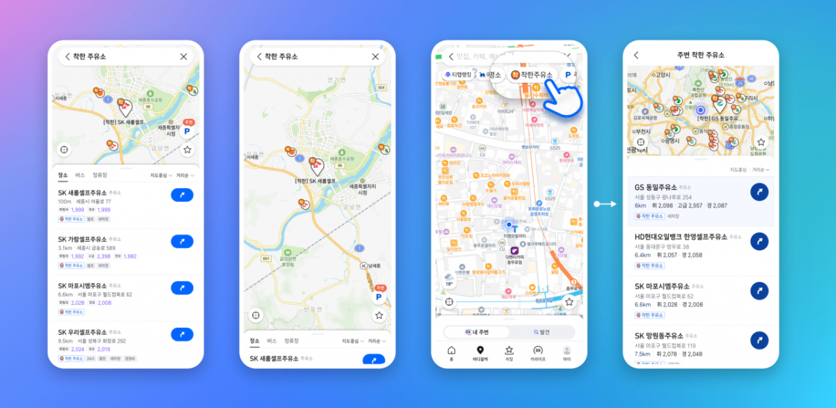 티맵 검색창에 '주유소' 또는 '착한주유소'를 입력하면 착한주유소 리스트를 바로 확인할 수 있다. 지도 위에서는 '착' 마커가 표시된다. 주유소 명칭 앞에는 '[착한]' 문구가 붙는다.