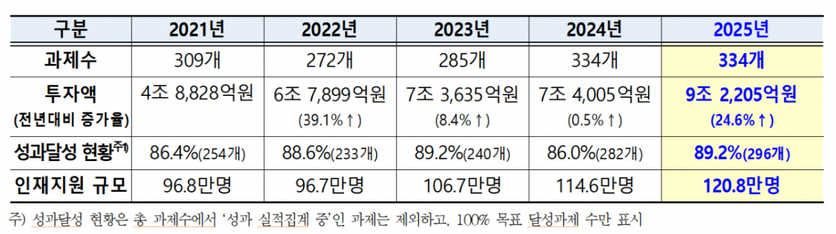 우선 미래인재특위는 지난해까지였던 제4차 과학기술인재 육성·지원 기본계획의 성과를 점검했다. 과학기술인재 육성·지원 기본계획은 '국가과학기술 경쟁력 강화를 위한 이공계 지원 특별법'에 따라 수립되는 과학기술인재 분야 최상위 법정 계획이다. 정부는 지난해까지 5년간 35조7000억원을 투자했고 매년 약 100만명의 인재를 지원했다. 특히 지난해 334개(중앙 217개·지자체 117개) 세부과제에 9조2205억원을 투자해 120만8000명을 지원했다.