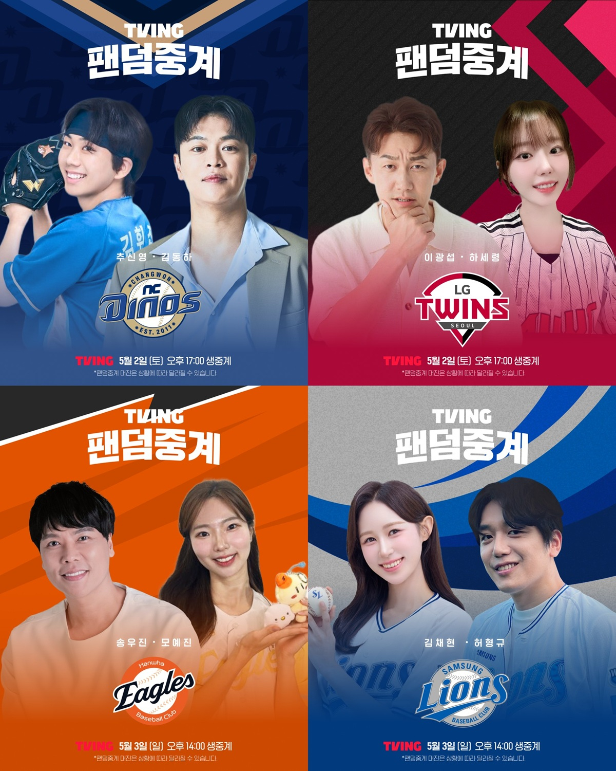 티빙은 오는 2~3일 KBO 리그 '팬덤중계' 라인업을 30일 공개했다. 팬덤중계는 각 구단을 응원하는 스페셜 호스트가 출연해 시청자와 실시간으로 소통하며 응원하는 티빙의 자체 중계 서비스다. 시청자는 실시간 채팅 기능 '티빙톡'으로 호스트와 의견을 나눌 수 있다.